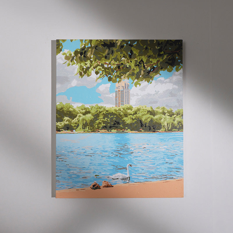 - Using a dry brush, apply the paint to the designated areas of the canvas.
